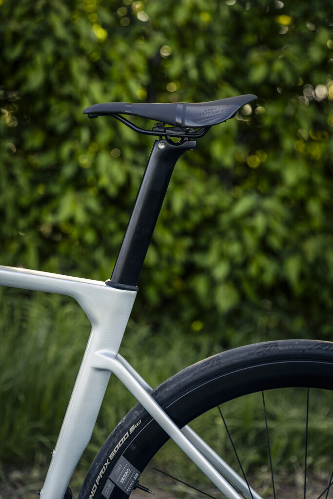 Sadlen er en Selle San Marco Shortfit monteret på en carbon-sadelpind fra Pronghorn. Sadelpindsbespændingen er blevet opgraderet siden sidste model, og man spænder den med en 4 mm unbrako i toppen af sadelrøret på undersiden af overrøret. Dejligt med en passende størrelse unbrakonøgle i stedet for en for lille torx, som på mange andre cykler.